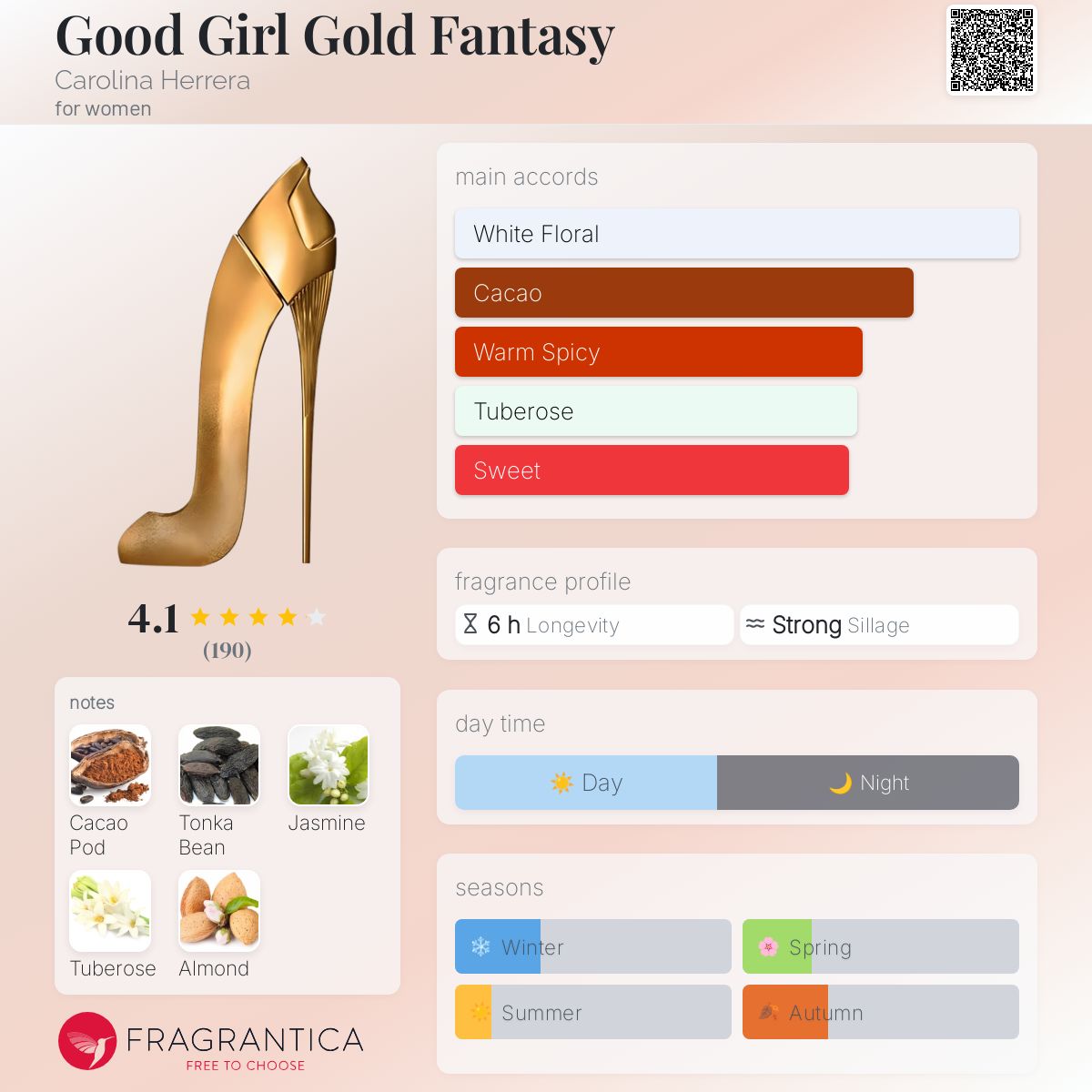 تنطلق تركيبته بافتتاحية ناعمة ومميّزة من اللوز، تمنح إحساسًا دافئًا ولمسة حلوة جذابة منذ اللحظة الأولى. في القلب، يتألّق مزيج أنثوي فاخر من ياسمين سامباك ومسك الروم، ليضيف عمقًا زهريًا راقيًا يعكس أنوثة قوية ومشرقة. أما القاعدة، فتستقر على نفحات الكاكاو مع حبوب التونكا، لتمنح العطر دفئًا حسيًا وثباتًا غنيًا يترك أثرًا مغريًا لا يُنسى.