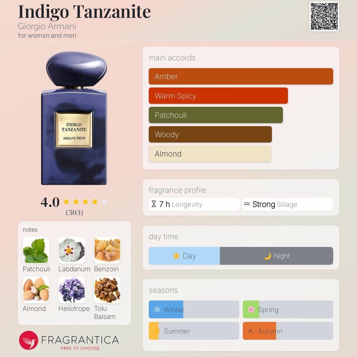 يجسد عطر إنديجو تنزانيت من ارماني الطبيعة الخلابة والمفعمة بالغموض التي تتميز بها الأراضي في تنزانيا وسمائها الساحرة ليلاً، كما ينعكس جمال حجر التنزانيت بلونه البنفسجي المائل للأزرق في توليفة العطر الآسرة، ويتميز بمكونات عليا منعشة من خلاصة البرغموت ونفحات اللوز ممزوجة مع نفحات رقيب الشمس التي تضفي لمسة ناعمة على المكونات الوسطى للعطر، ويبرز جمال عبير البتشول المفعم بالغموض بنفحات عنبرية جذابة تعكس ظلمة الليل الساحرة.