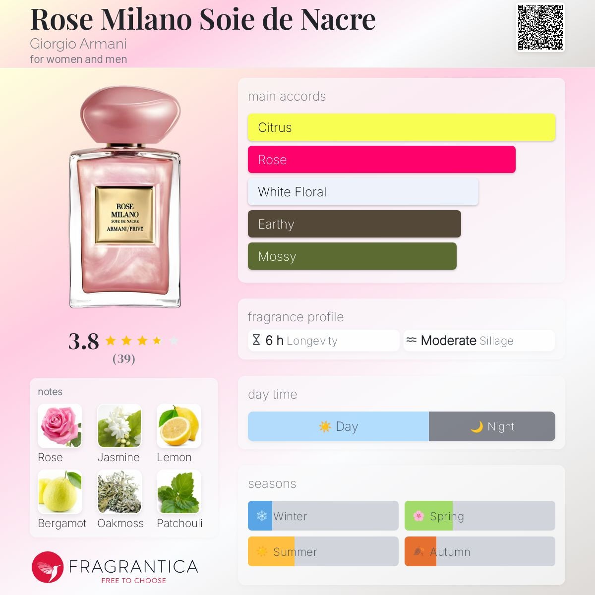 أعاد جورجيو أرماني تفسير الوردة مع الروائح الحمضية والعصرية لليمون بريموفيوري، مما ينير الورد الدمشقي المهيب، في حين أن المكونات الترابية للباتشولي الحديث تحول العصير إلى اتفاق شيبر مبدع وأنيق، مملوء بلآلئ حريرية المظهر لإضاءة البشرة.