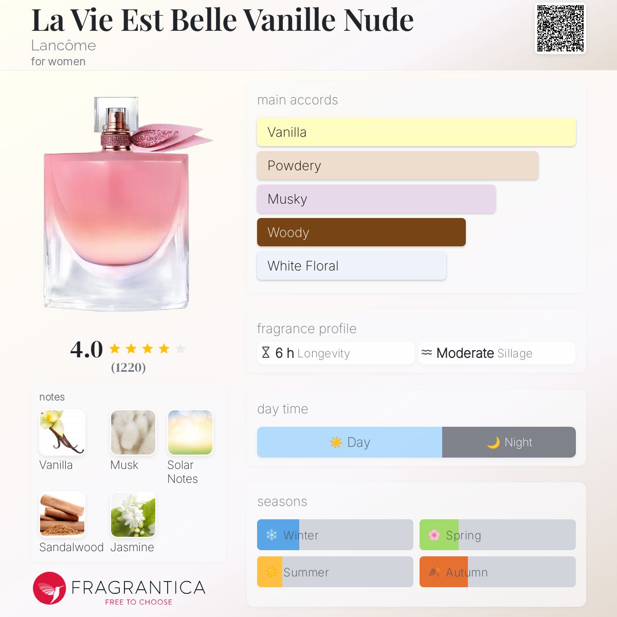 La Vie Est Belle Vanille Nude هو إصدار جديد ناعم وحسي من دار Lancôme، يعيد تقديم توقيع La Vie Est Belle الشهير بأسلوب أكثر دفئًا وهدوءًا، وقد جاء بتوقيع العطّارين Anne Flipo وDominique Ropion ليجسّد جمال البساطة والأناقة الطبيعية.