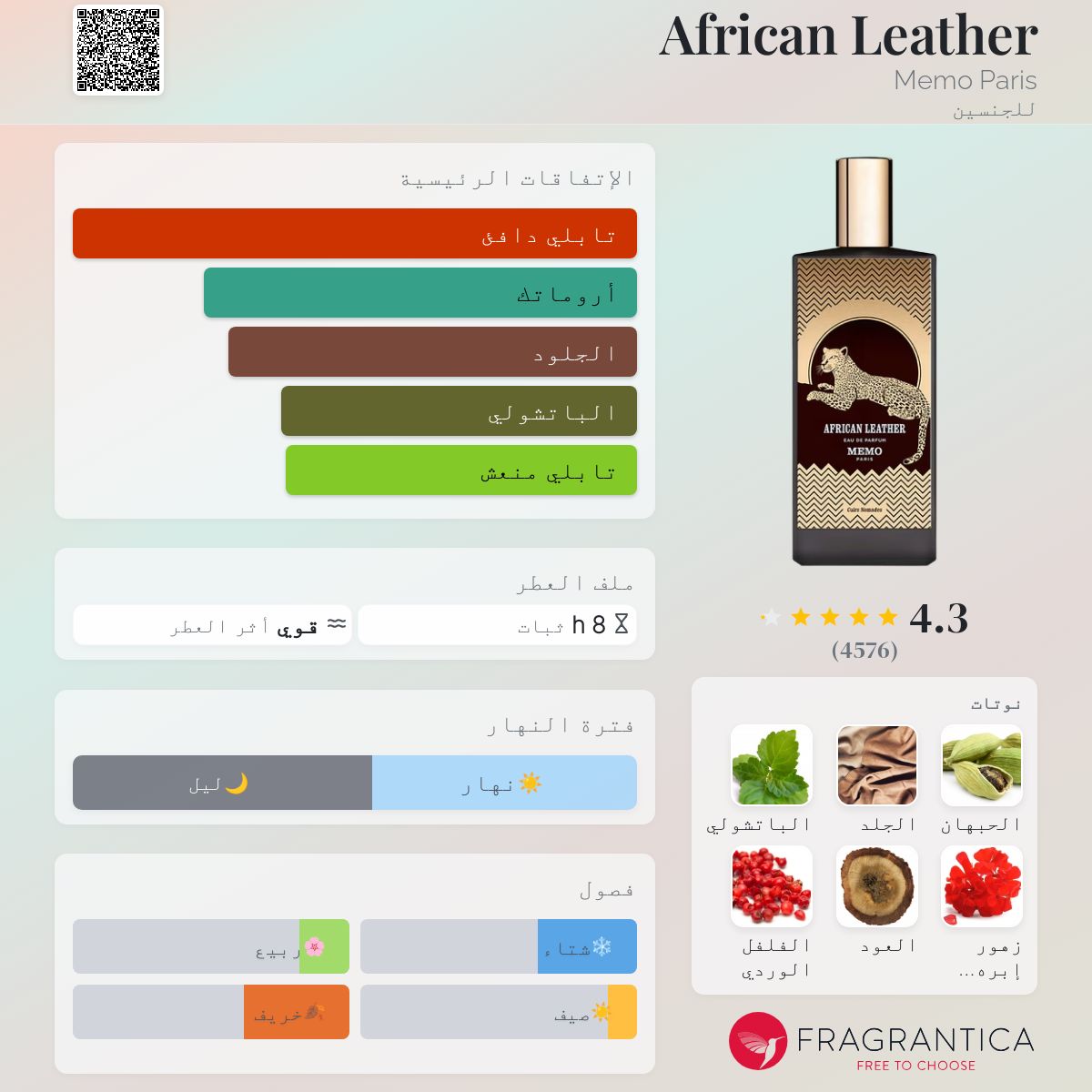 African Leather Memo Paris عطر الجلود للرجال و النساء. African Leather صدر عام 2015. Alienor Massenet قام بتوقيع هذا العطر. إفتتاحية العطر الهيل, إبره الراعي و الفلفل الوردي; قلب العطر الباتشولي, القرفة و الورد; قاعدة العطر تتكون من الجلود, العود و العنبر.