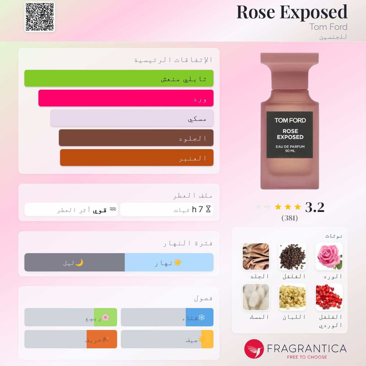 حين تُكشف الوردة عن جوهرها الحقيقي… يولد Rose Exposed من Tom Ford — عطر زهري – خشبي – مسك للرجال و النساء، يجسد التناقض الساحر بين النعومة والقوة.