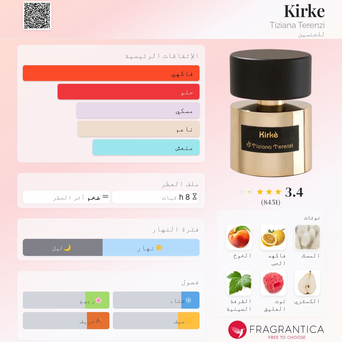 Kirke Tiziana Terenzi عطر تشيبر – فواكه للرجال و النساء . Kirke صدر عام 2015. Paolo Terenzi قام بتوقيع هذا العطر. إفتتاحية العطر الباشون فروت, الخوخ, الكمثري, توت العليق, أوراق القرفة الصينية و رمال; قلب العطر زنابق الوادي; قاعدة العطر تتكون من المسك, خشب الصندل, الفانيليا, الباتشولي و الهيلوتروب.
