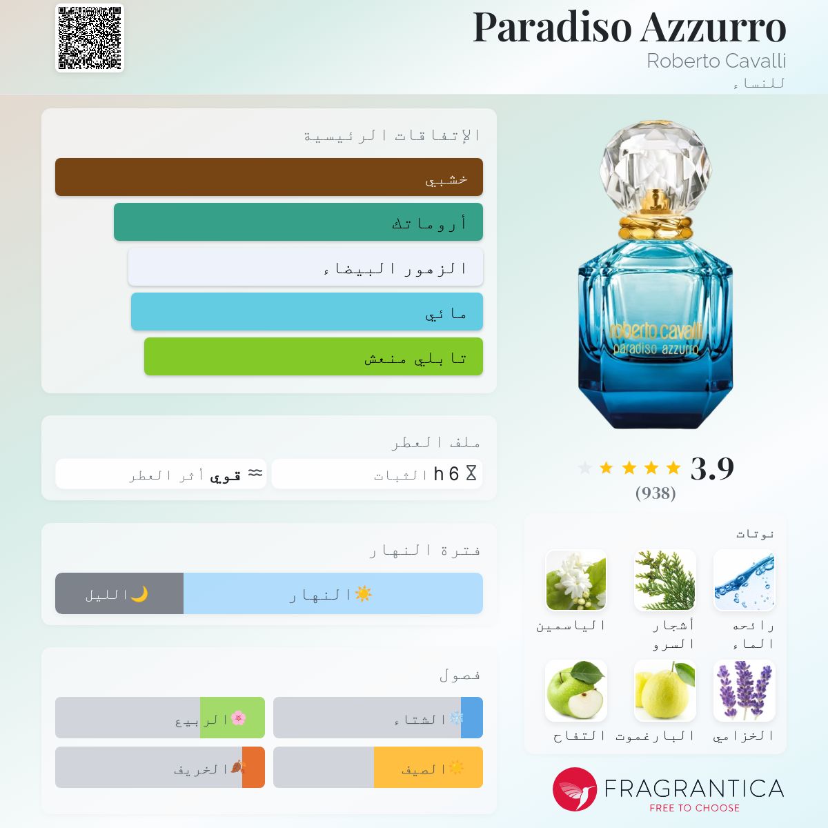 Paradiso Azzurro من دار Roberto Cavalli هو عطر أنثوي يعكس أجواء البحر الأبيض المتوسط بكل ما تحمله من صفاء وأناقة، وقد جاء بتوقيع العطّارة Louise Turner ليقدّم تجربة عطرية منعشة ومضيئة بلمسة أنثوية راقية.